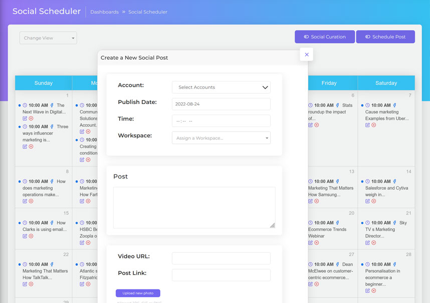 Plan social posts for Facebook, Twitter, LinkedIn, and Instagram across multiple accounts. Automatically gather content from relevant blog feeds and schedule posts effortlessly.